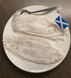 the fish fillets benefit from a dusting of plain flour in preparation for their pan fry in butter;