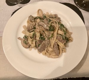 Ok so saute those onions in my trusted Le Creuset; teaspoon of flour; rosemary; splash of sherry; wee bit of red wine left in that bottle – in it goes; ah here comes the cream. “Thank you Darling”. Mushrooms in. Some spinach left in that bag – pile it in.