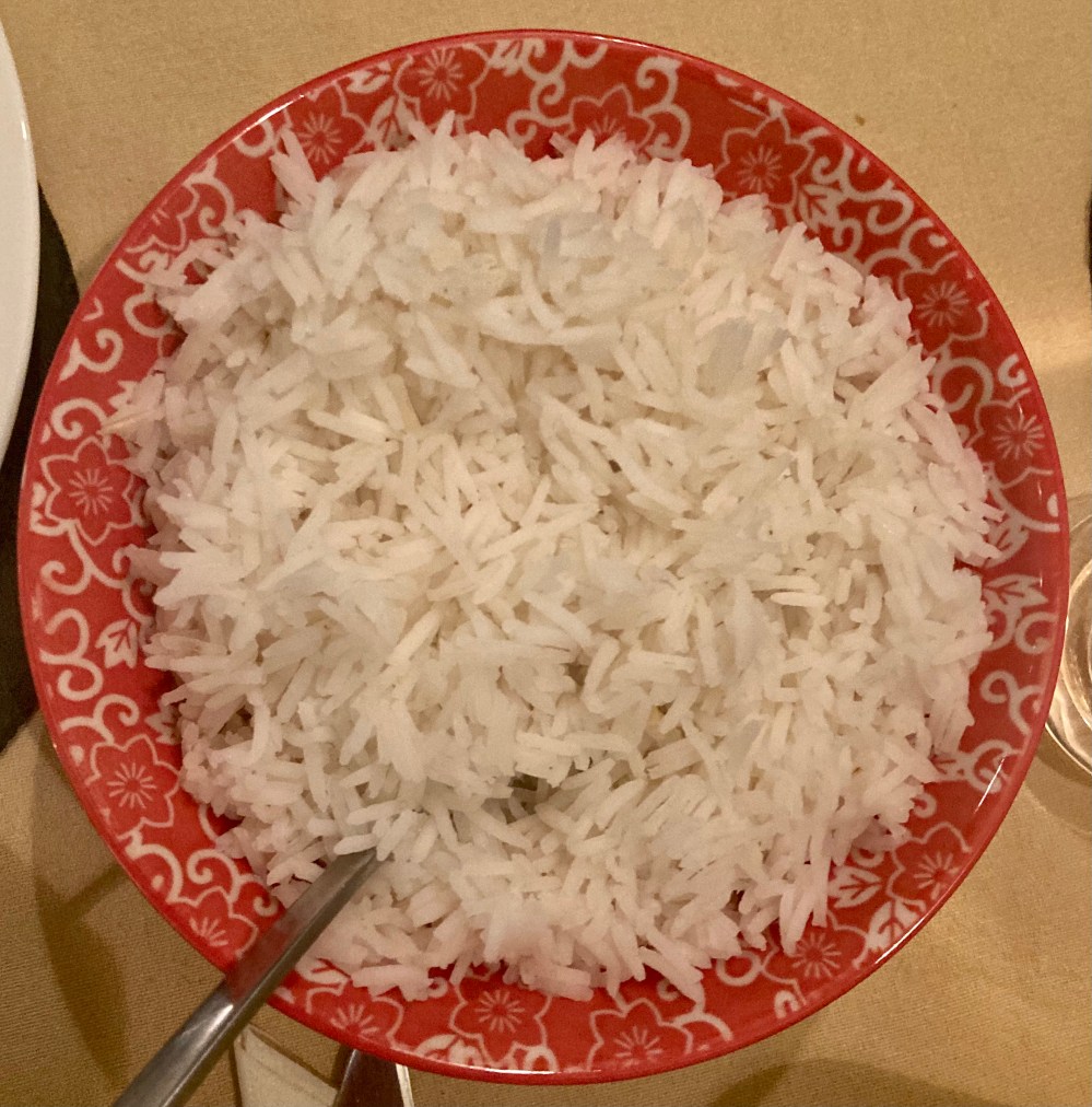 Then there’s the rice. I was wedded to the one cup of rice to two cups of boiling water, lid on and simmer until water gone method. That was until the lovely Pete took over rice duty. One cup of rice is the perfect measure for a generous helping for two, but Pete’s method is to boil on high heat openly with bucketloads of water. It works to produce perfectly fluffy separated rice grains every time.