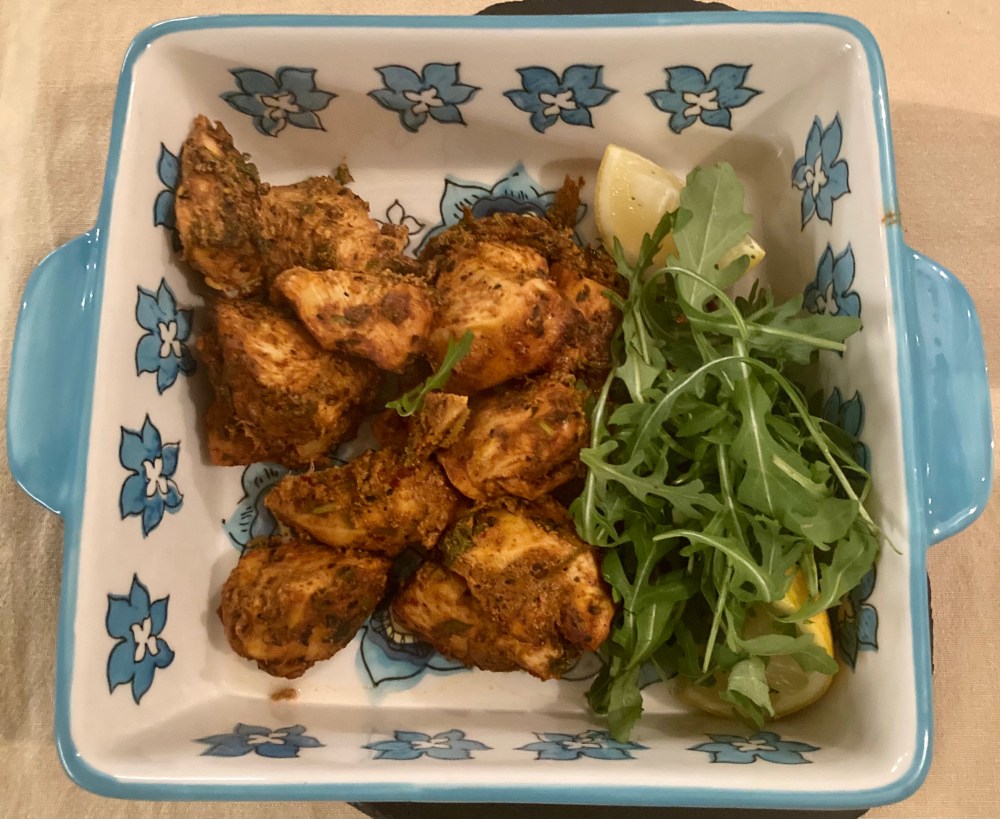 I had spotted a Tandoori paste in the Waitrose recently which I used with natural yogurt to marinate some of the chicken. It’s always nice to have a sauce with this style of food so I made a simple medium style curry sauce to accompany. Oh, it felt like a bit of banquet was in the making.